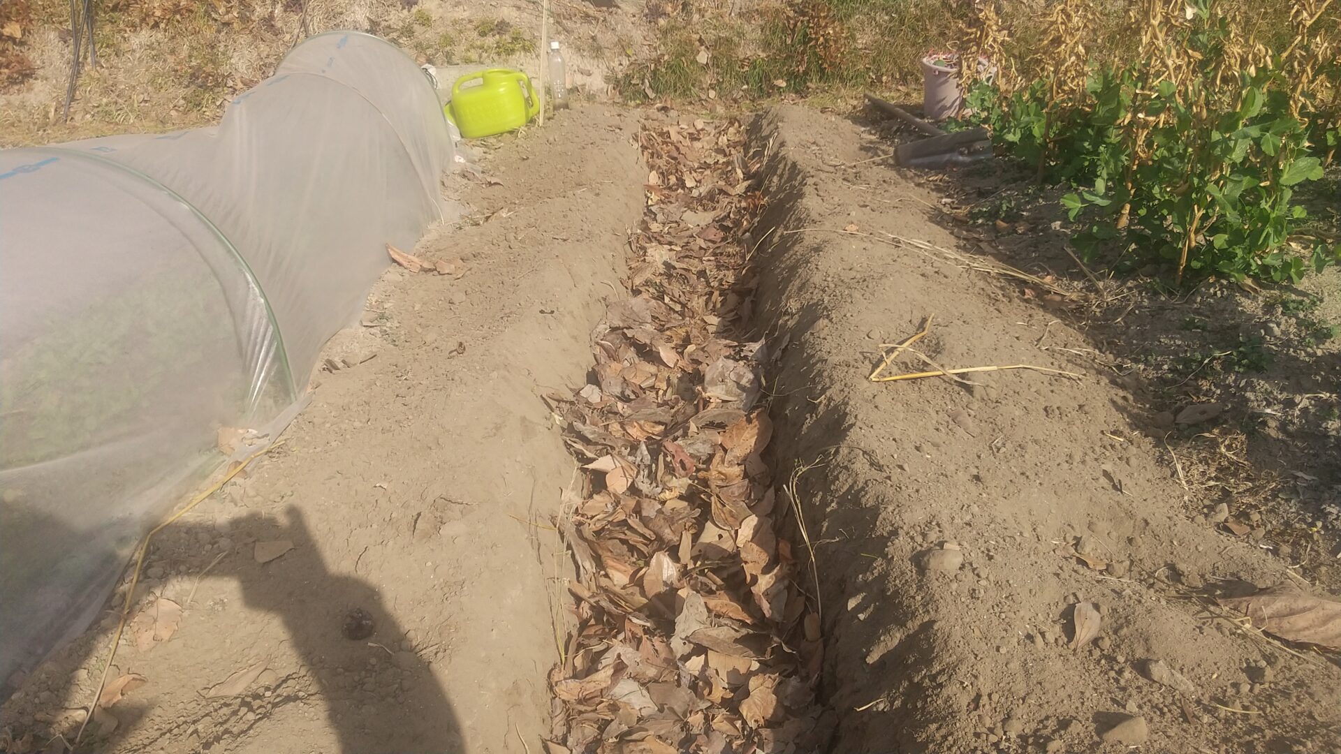 家庭菜園畑に溝の浅い(30㎝から40㎝)落ち葉床を作る