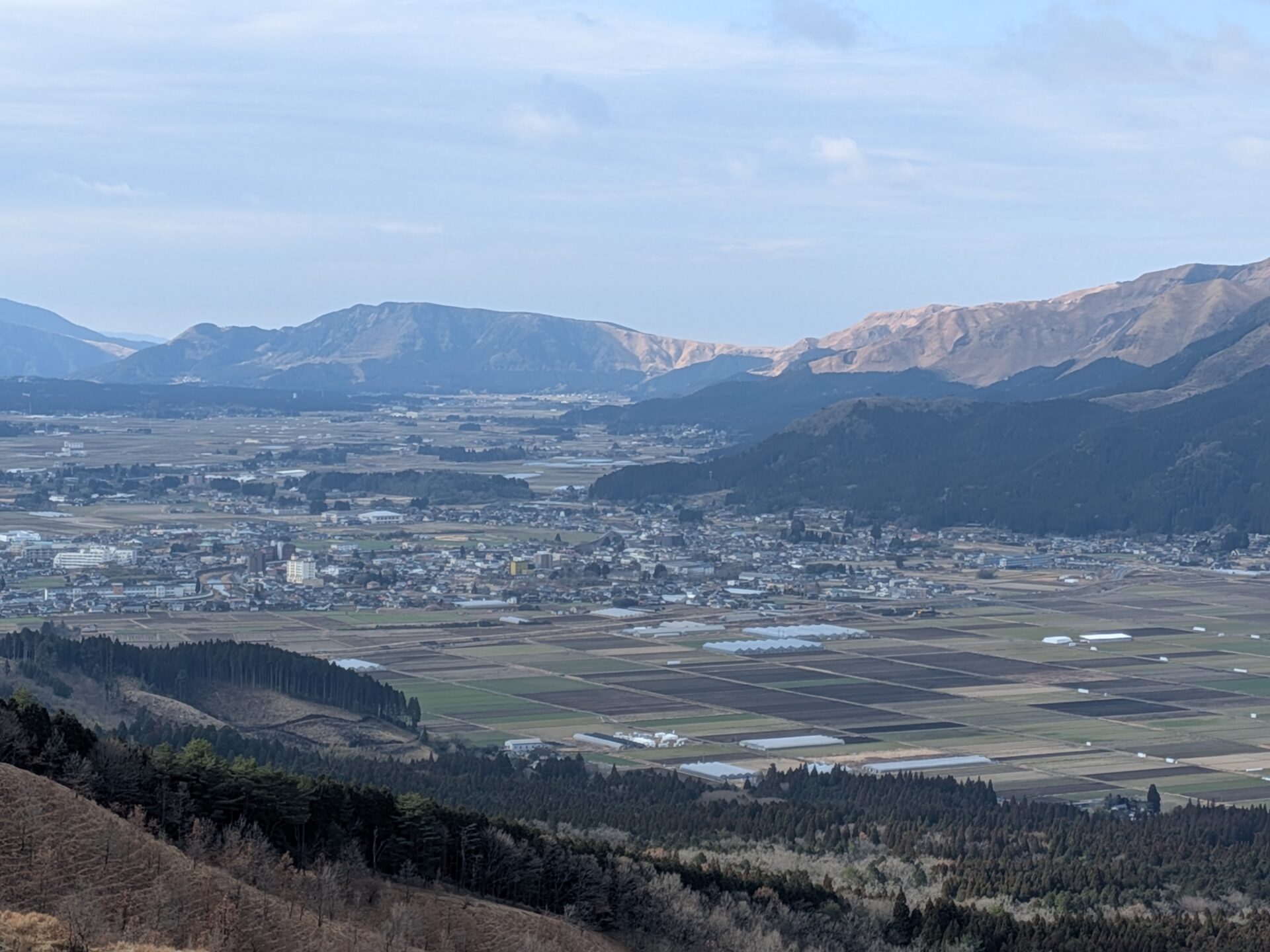 外輪山と盆地、雄大なパノラマは大絶景でした。新緑のころお邪魔したいものです。